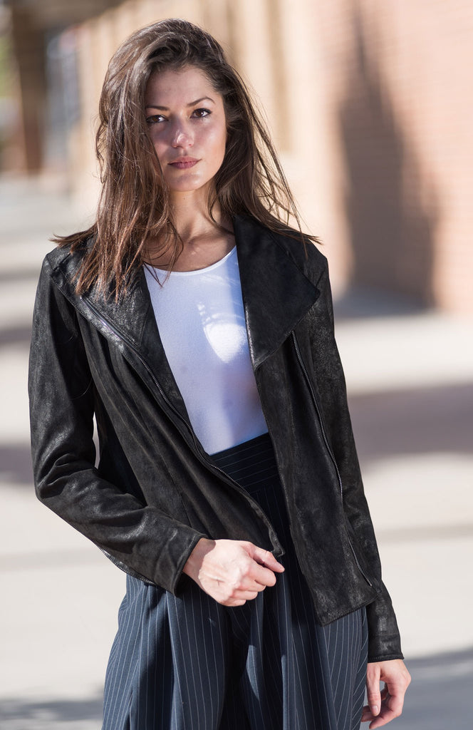 Want a great, lightweight jacket that will go anywhere? Try Jacket One. We couldn't resist making a jacket out of our favorite stretch lambskin. And the result is timeless. This jacket is sturdy yet fun and light. Wear it to the movies, on a ride or out to dinner. This jacket is Up For It. Made in Oklahoma.