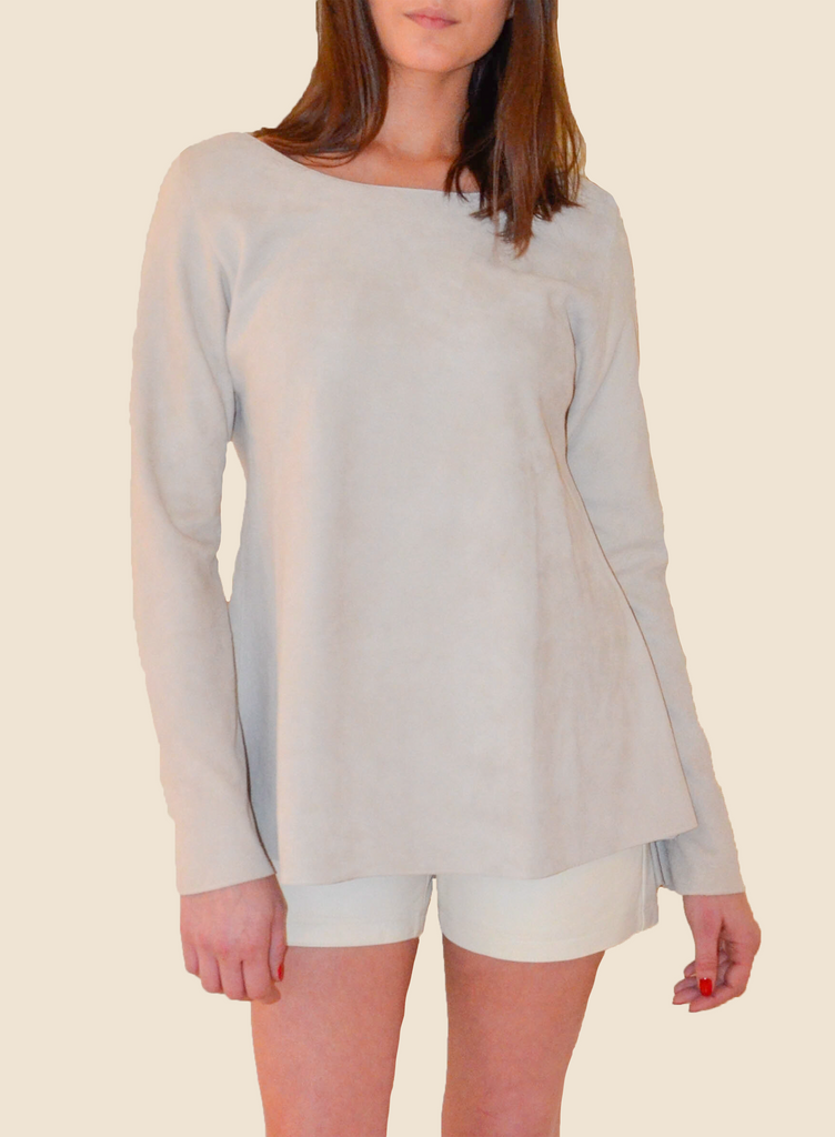 Our Katie Top is our answer to the change of seasons. Made of 'Velvet' suede that is even better than velvet -- cozy yet comfortable and elegant. Long sleeves with a tapered-to-full cut and flattering scoop neck in back. Katie is a perfect piece to have in your wardrobe. Made in Oklahoma.