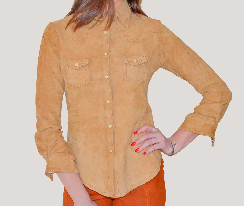 Our homage to the Western Heritage lifestyle never better represented than with our Ladies Pearlsnap top. Exquisite detailing coupled with our signature stretch leather make this top functional and fashionable. Designed for a snug fit, our Pearlsnap belongs anywhere from the Range to Las Cuevas in the heart of Madrid. Lightweight, washable leather suede. Made in Oklahoma.